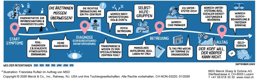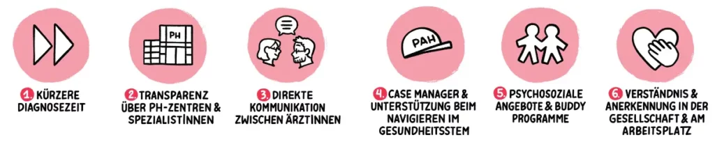 Innerhalb der Schweizerischen Gesellschaft für Pulmonale Hypertonie (www.sgph.ch) verstärken wir die Zusammenarbeit zwischen den PAH-Zentren in der Schweiz. Sensibilisierungsmassnahmen richten sich an die breite Öffentlichkeit und an Angehörige der Gesundheitsberufe, um die Erkennung und Behandlung von PAH zu verbessern. Dies entspricht den von den Patient:innen geäusserten Bedürfnissen: eine erleichterte Kommunikation zwischen Ärzt:innen, eine koordinierte Behandlung innerhalb des Versorgungsnetzwerks sowie ein besseres Verständnis in der Öffentlichkeit.